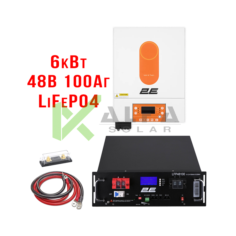 Мощность инвертора: 6 кВт / Тип солнечного контроллера: MPPT / Напряжение: 48В / Установленная емкость АКБ: 1х100 Ач /Тип АКБ: LiFePO4