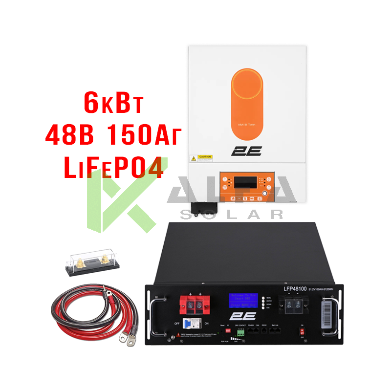 Мощность инвертора: 6 кВт / Тип солнечного контроллера: MPPT / Напряжение: 48В / Установленная емкость АКБ: 1х150 Ач /Тип АКБ: LiFePO4