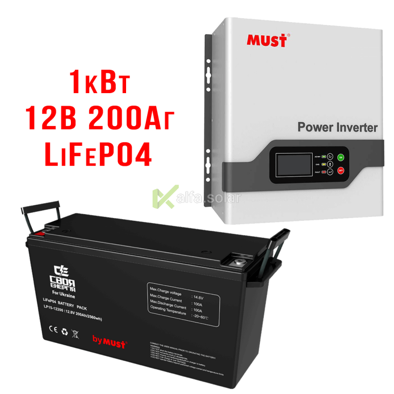 В комплект входит надежный инвертор Must EP20-1000 (обновленная модель) и современный циклический аккумулятор СВОЯ ЭНЕРГИЯ by MUST LiFePО4 12V 200Аh (до 6000 циклов при 80% глубине разрядки).
