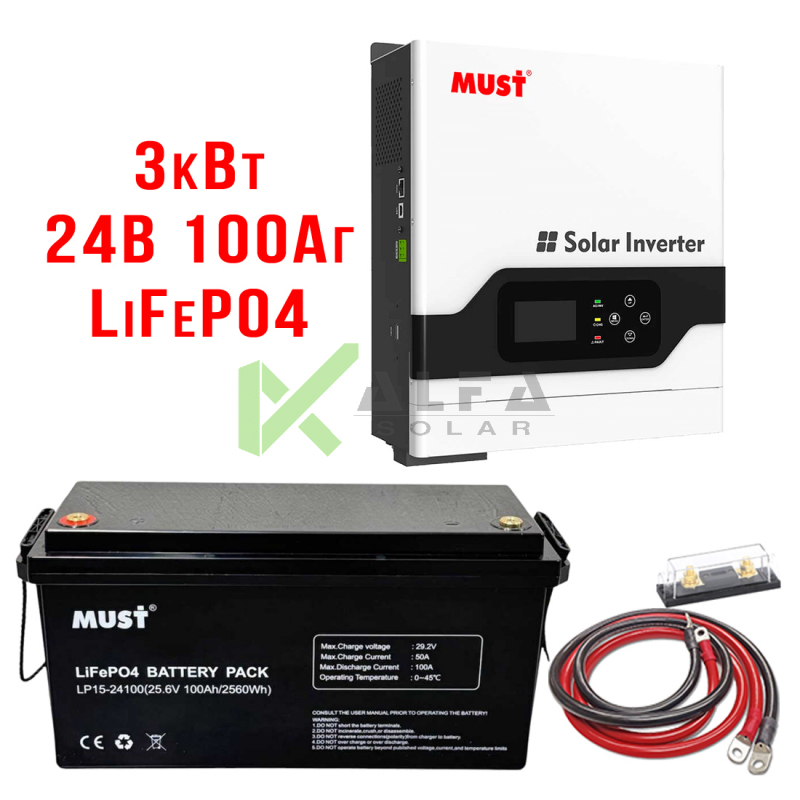 Мощность инвертора: 3 кВт / Тип солнечного контроллера: MPPT / Напряжение: 24В / Установленная емкость АКБ: 1х100 Ач /Тип АКБ: LiFePO4
