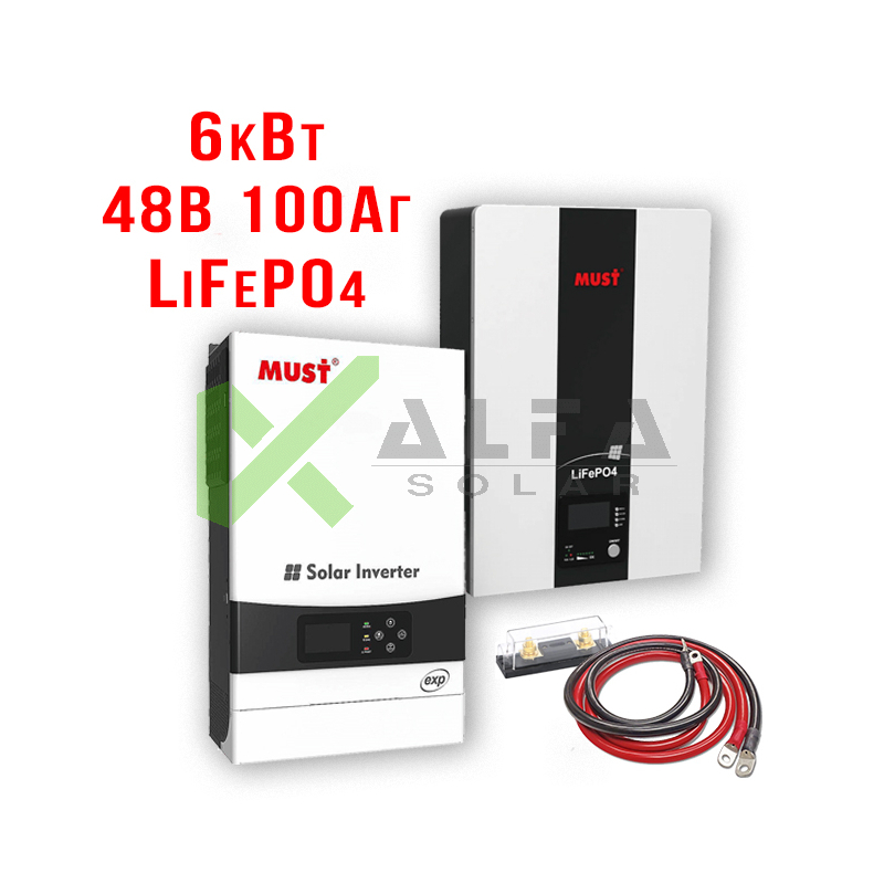 Мощность инвертора: 6 кВт / Тип солнечного контроллера: MPPT / Напряжение: 48В / Установленная емкость АКБ: 1х100 Ач /Тип АКБ: LiFePO4