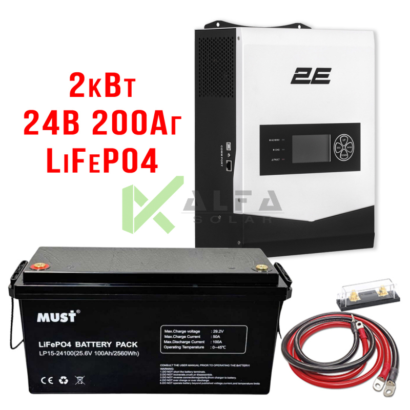 Потужність інвертора: 3кВт / Тип сонячного контролера: MPPT / Напруга: 24В / Встановлена ємність АКБ: 1х100 Аг /Тип АКБ: LiFePO4